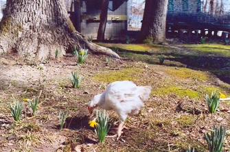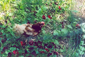 Lucy was purchased from a commercial egg facility, where the hens live crowded together in wire cages, including a sloped wire floor, so small they can’t spread their wings. Though young (approximately 2 years), she was considered “spent” and scheduled for slaughter. She and 20 others were saved, but the other 8,000 in her shed were slaughtered. More on the egg industry here.
